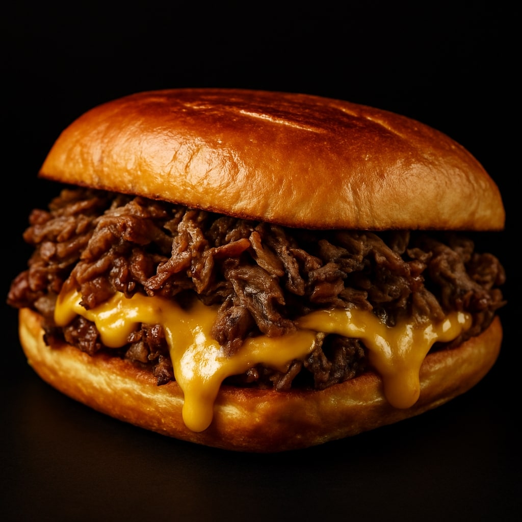 Slow-cooked Juicy beef with gooey cheese, a powerhouse of flavor on a toasted roll